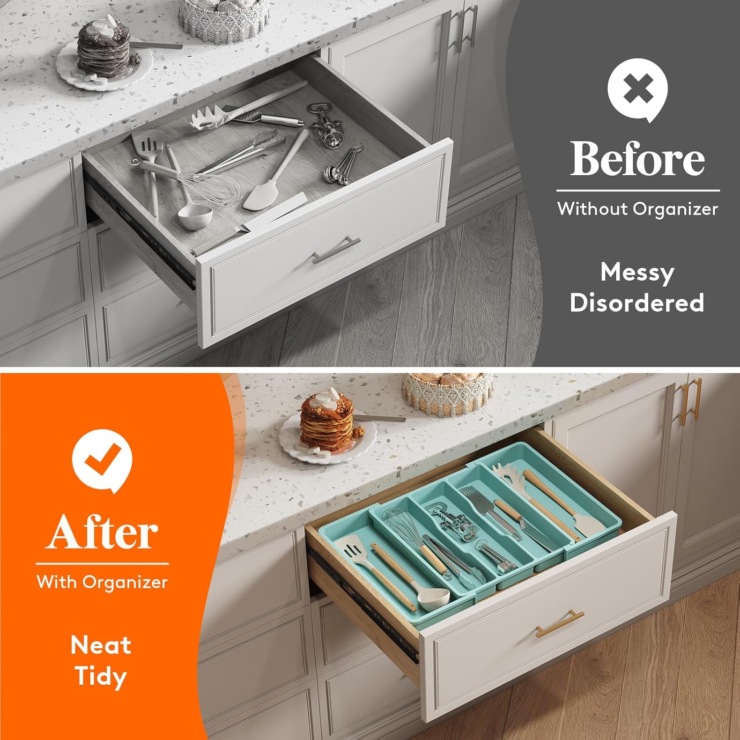 Lifewit Utensil Organizer for Kitchen Drawers, Expandable Cooking Utensil Tray, Adjustable Cutlery Silverware Flatware Holder, Plastic Spatula Tools and Gadgets Storage Divider, Large, Turquoise