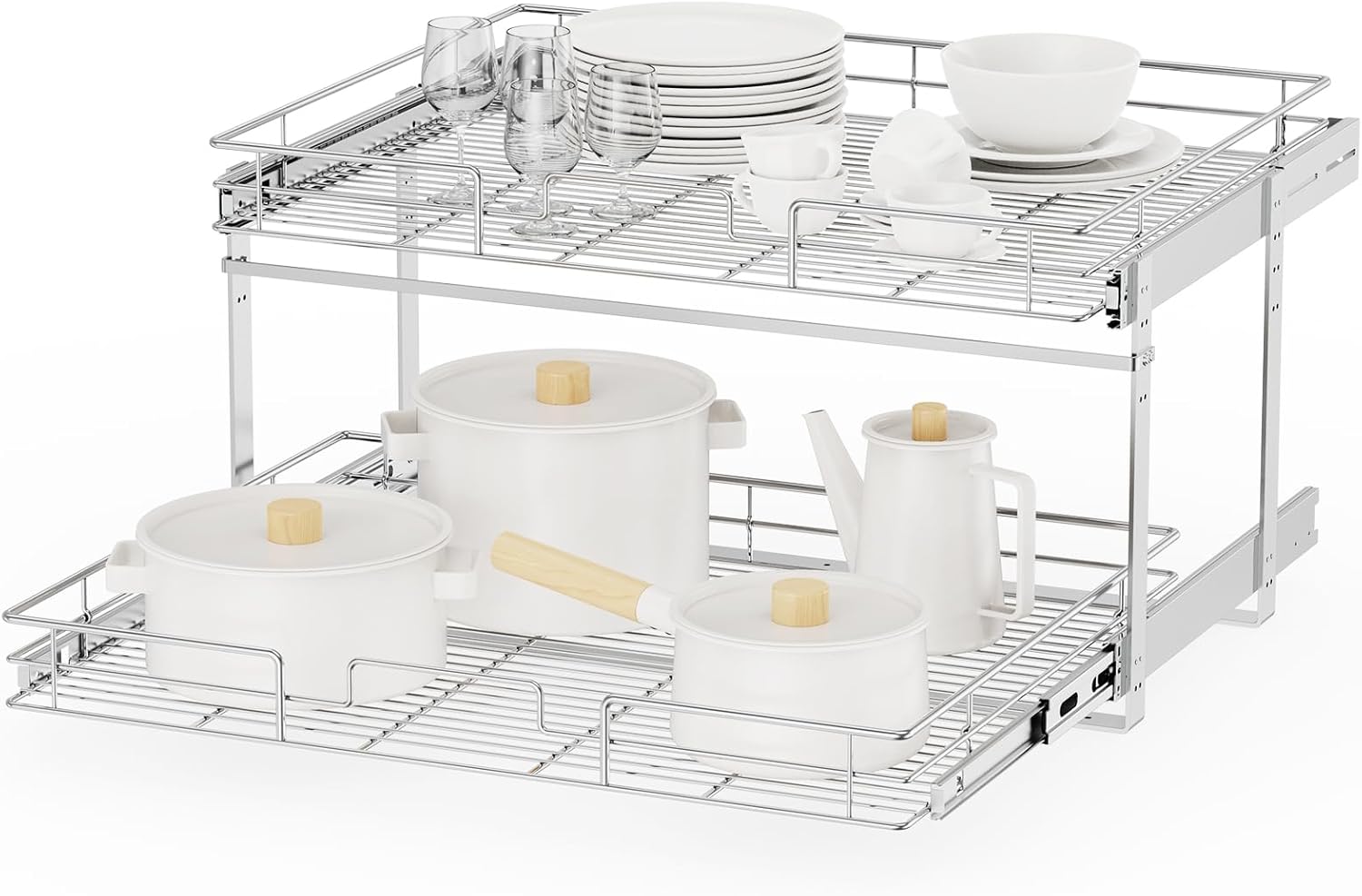 - 【Space-saving Pull Out Cabinet Organizer】This slide out cabinet organizer can maximize your cabinet space. Makes it super easy to store, organize, and access your stand mixers, pots, pans, baking sheets and other kitchen accessories, cleaning supplies, and various odds and ends. Now your cabinet is no longer just stacks of potspans.