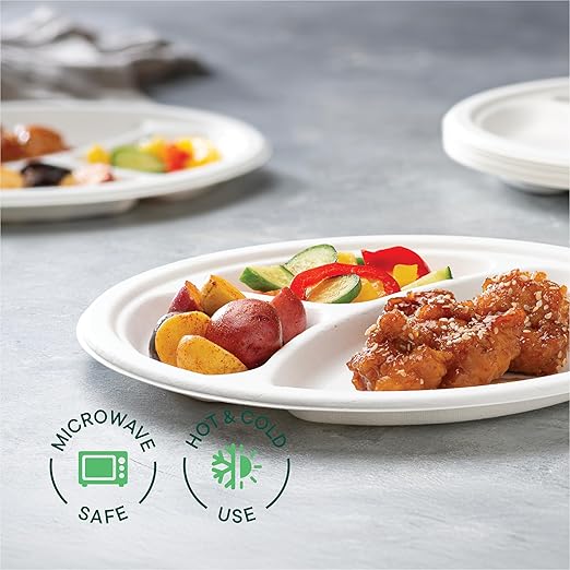 - 10 inch Paper Plates with Three Compartments Serve full Meals in Convenient Style with Quality Compostable & Biodegradable Plates. Perfect size to serve a main dish with two sides. The Biodegradable Plates makes a Great Choice for your Daily Meals or Restaurants, Food Trucks, To-go Orders, Special Events, and other types of Food Service Environments.