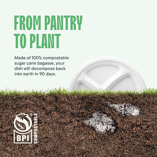 - 100% Compostable: Since it’s Made from 100% Sugarcane Fiber, the Plate can be Commercially Composted (no need to send it to a landfill). The Plate offers a Disposable Design that will Degrade Quickly, which means Convenient Cleanup for You, your Customers, and the Planet. This Product Meets ASTM D6400 or D6868 and is Intended to be Composted in a Municipal or Commercial Facility Operated in Accordance with Best Composting Management practices.