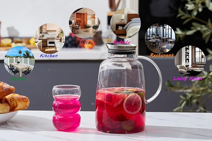 - [Elegant Design]: This glass pitcher has a classic design, Handmade, beautiful looking, large handle for comfortable grip. Proper size for making it a practical kitchenware, but also an attractive decoration on the table when you make nice-looking beverage. This pitcher is widely used for water, fruit infused water, cold brew iced coffee, iced tea, hot tea, lemonade, cucumber water, fruit soda, homemade beverages, sangria, fruit alcoholic drinks, milk, wine, cocktails, juice, etc.