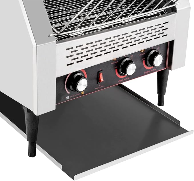 - 【Easy to Operate】: Designed with a clear control panel, a control switch, independent upward and downward heating temperature knobs, and a multi-speed knob, you just need to feed the bread in the conveyor and spin the knob according to your needs.