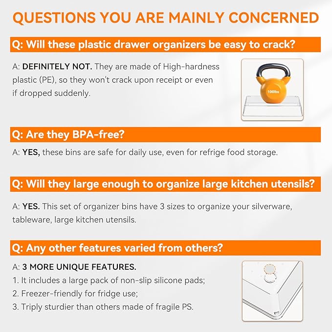 - 【FOOD-GRADE QUALITY】Crafted from premium PET plastic, our desk drawer organizers are twice as sturdy as other fragile ones, and resistant to cracks and scratches. No smells, and safe as food storage, refrigerator pantry organizer and storage. (If quality fails, we'll provide you with a new complete set.)