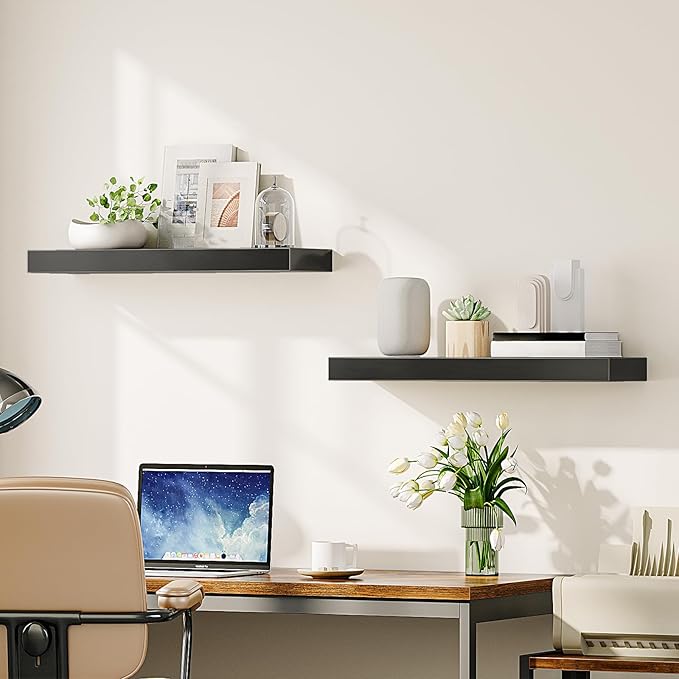 HOOBRO Floating Shelves for Wall, Wall Mounted Shelf Set of 2, 23.6" Hanging Shelf with Invisible Brackets, for Wall in Bathroom, Bedroom, Toilet, Kitchen, Living Room, Office, Black BK60BJ01