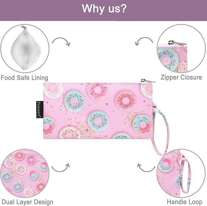 Reusable Sandwich Bag/Snack Bag for Kids & Adults, Dual Layer Lunch Bag with Handle, Washable, Food Safe, BPA Free (2-Pack, Colorful Donut)