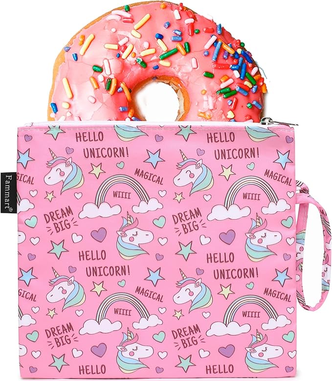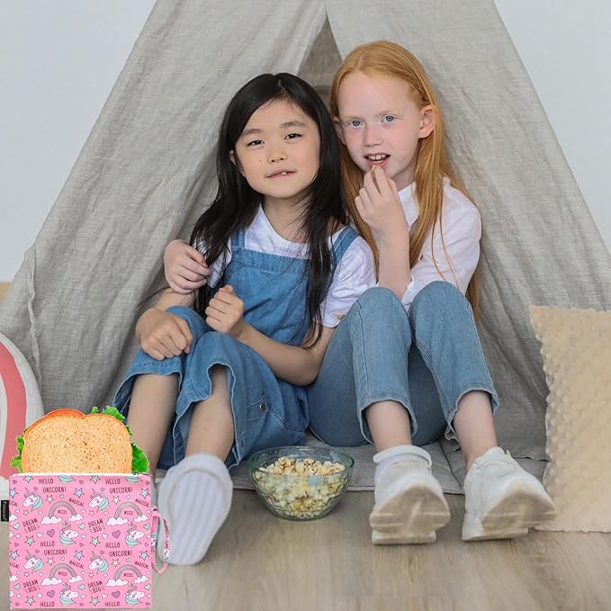 Reusable Sandwich Bag/Snack Bag for Kids & Adults, Dual Layer Lunch Bag with Handle, Washable, Food Safe, BPA Free (1-Pack, Rainbow Unicorn)