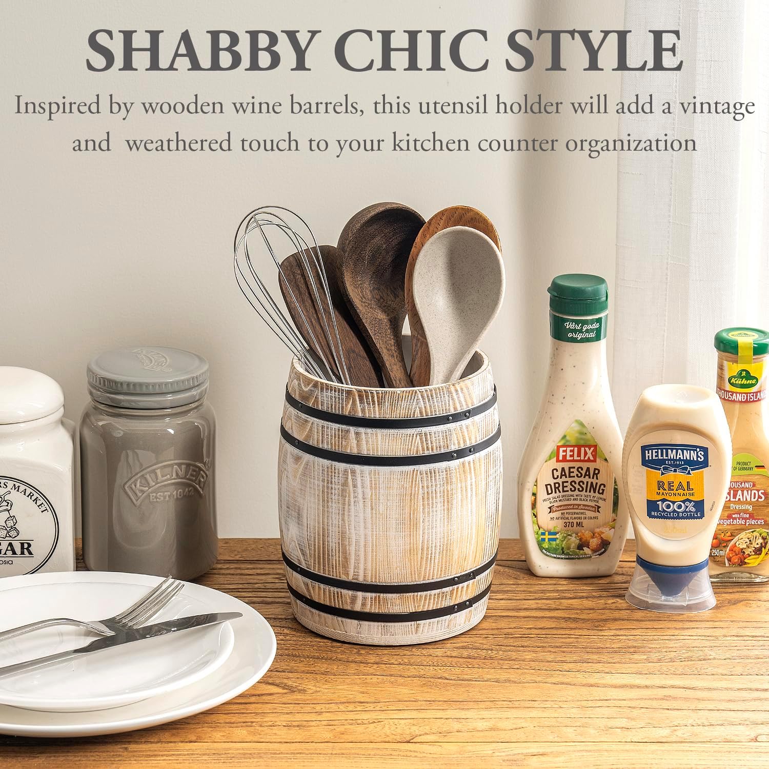 - Inspired by wooden wine barrels, this utensil holder will add a vintage and weathered touch to your kitchen counter organization