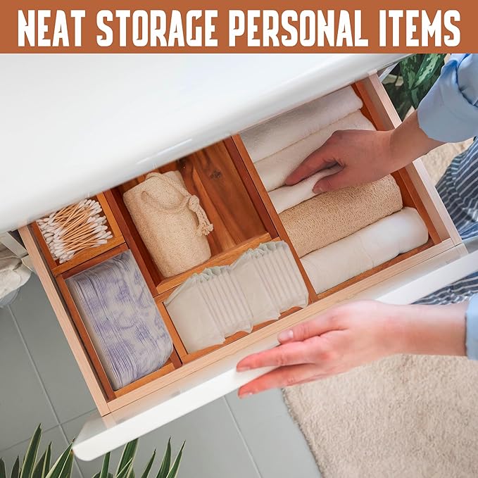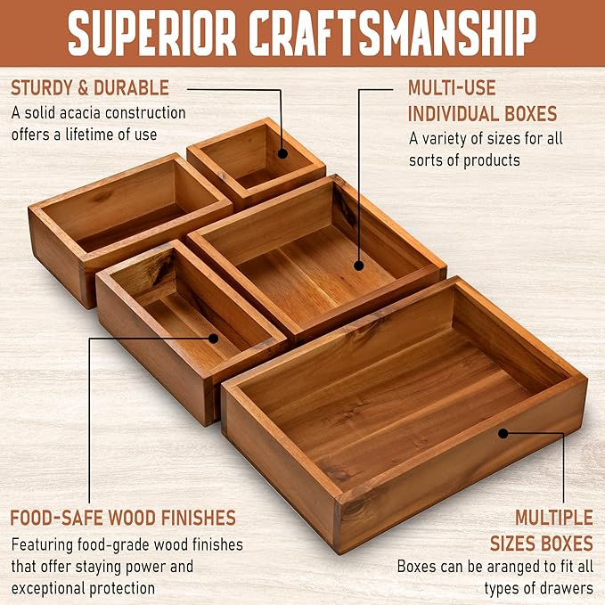- Useful Kitchen Divider Boxes: Simplify your kitchen organization with these utensil storage trays. With 5 sturdy and durable acacia containers, allowing you to conveniently view and store your collection of small culinary gadgets, cookware accessories, and cooking tools. Experience a clutter-free space with our practical storage solution, featuring deep compartments that fit perfectly in drawers.