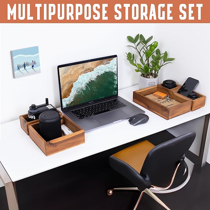- Optimal Wood Storage Boxes for Office Tools & Accessories: Streamline your tabletop and cabinet space with these helpful acacia wooden trays, serving as a neatly arranged office organizer. Save your office supplies in your desk drawer to keep pens, markers, staplers, paper clips, scissors, sticky notes, and calculators. The tray edges with a height of 2.17 inches make it useful for storing even taller tools. Additionally, the storage bin with the smallest dimensions can provide an ideal saving box for your jewelry, hair ties, watches, bracelets, and necklaces.