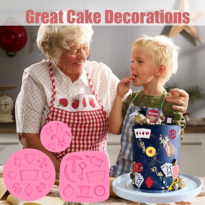 - [POKER SILICONE MOLD]: 1 Pcs Poker Silicone Mold, 1 Pcs 3D Casino Themed Chocolate Molds and 1 Pcs Playing Cards Candy Molds. You Can Use it to Make Rich Casino Themed Cake Decorations, Enough for Your Baking Needs.