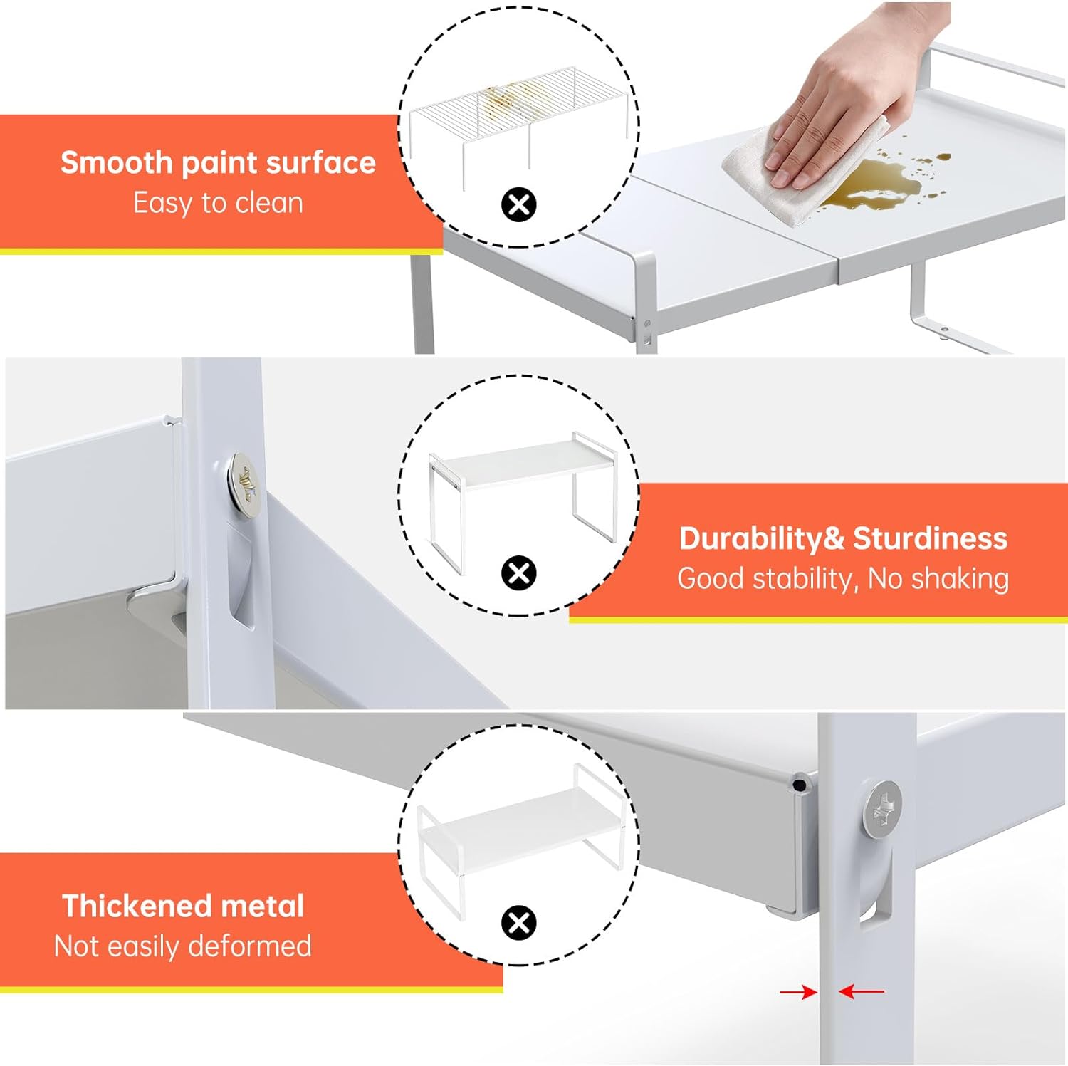 - The expandable kitchen shelf is made of sturdy metal with an anti-rust coating, ensuring its durability and longevity. The high-polishing anti-rust coating technology used on the adjustable pantry shelf ensures that it will last for many years and is easy to maintain and clean. Kitchen counter organizer is suitable for cupboard organizers and storage.