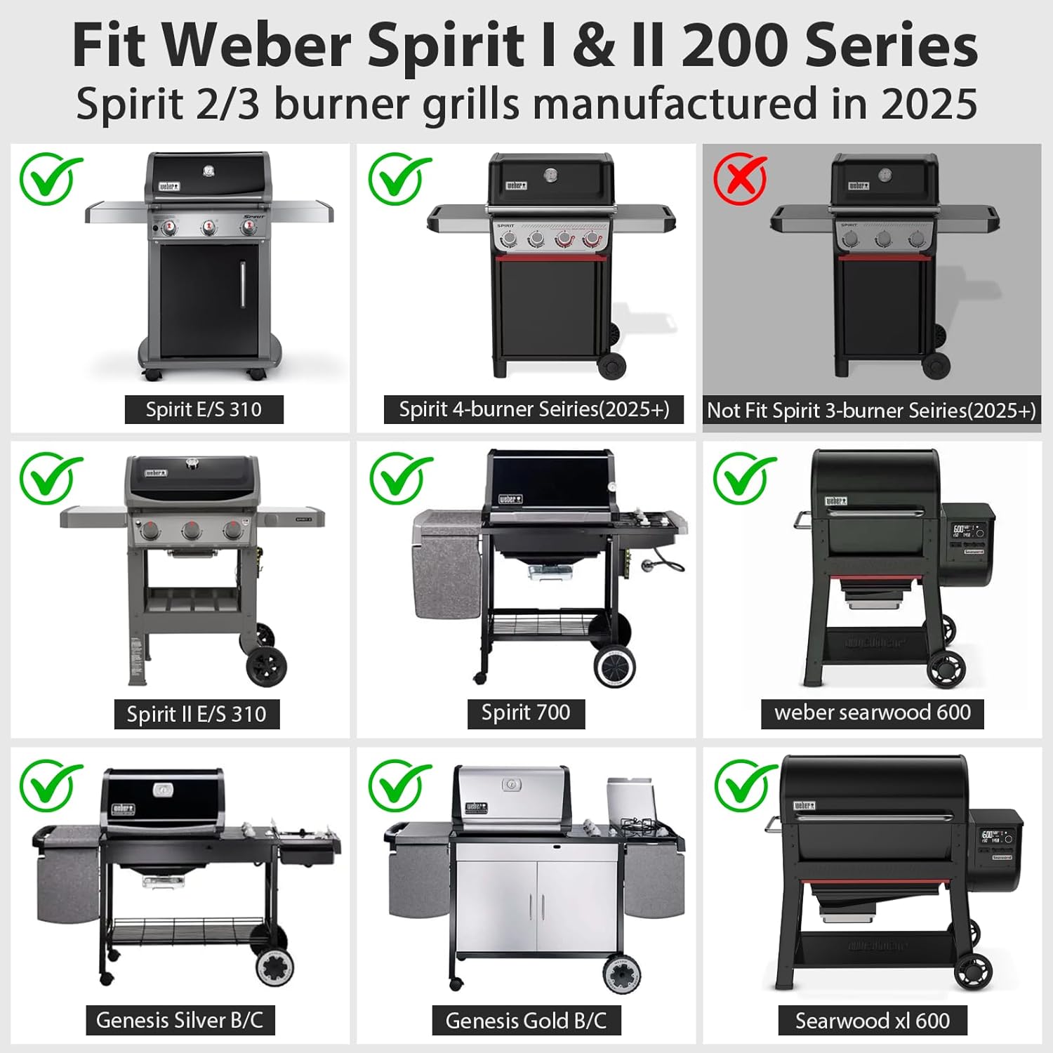 - Also Fits Spirit 4-Burner & Searwood Pellet Grills – Designed for weber Spirit 4-burner grills (manufactured since 2025) E-425, S-425, E-435, EP-425, EP-435, and Searwood 600, XL 600 pellet grills(Need to remove the heat plate for use).