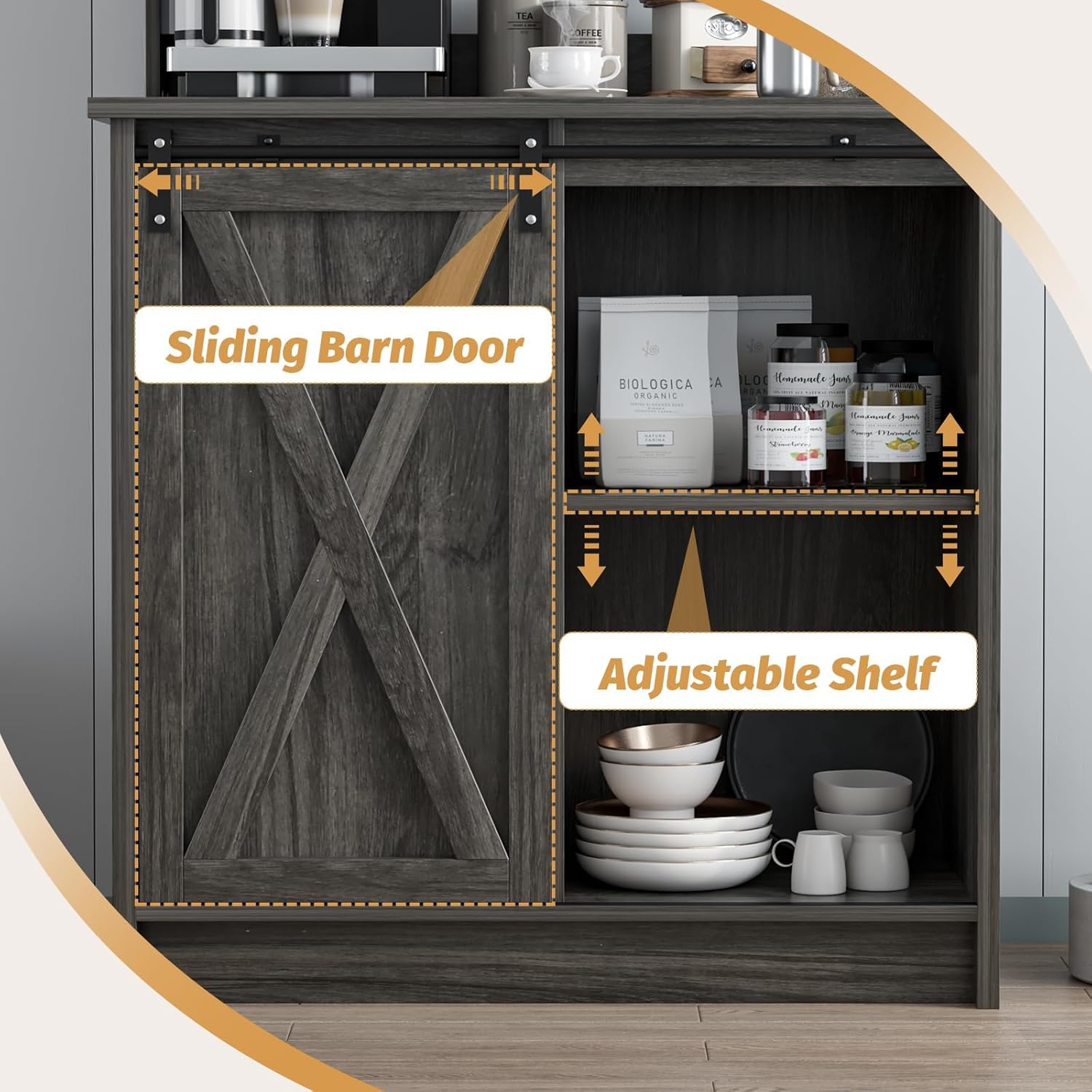 4ever2buy Farmhouse Coffee Bar with Hutch, 31 Inch Buffet Cabinet with Sliding Barn Door, Storage Bar Cabinet with 6 Hooks, Coffee Bar Table with Adjustable Shelves for Living Dining Room, Grey