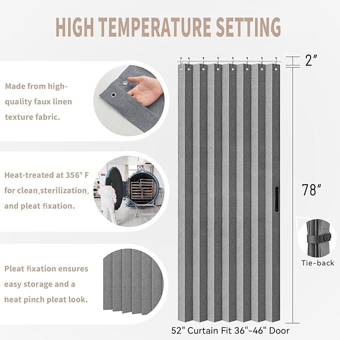 - Design Inspiration: Our door curtains combine accordion-style pleated folds without the high price of traditional accordion doors. They offer the affordability of fabric door curtains while avoiding the appearance by lacking pleats and appearing cheap. Our product effortlessly marries the elegance and durability of folding doors with the economic benefits and easy installation of fabric door curtains