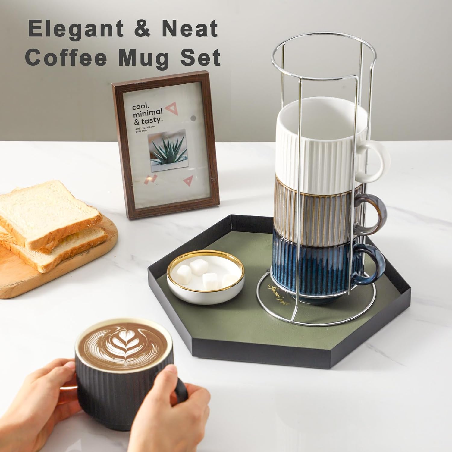 - Space Saving Metal Latte Cup Stand: Save a large area of counter by stacking cup neatly on the solid metal coffee cup rack, making the most of limited space to keep your room tidy and organized for mug set of 4