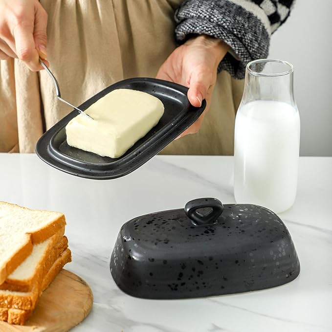 - 【STYLISHNESS AND ELEGANCE】The matte black butter dish is decorated with a unique glossy black dot, making black no longer a constant dull feeling. The rounded edge of the butter dish cover adds an element of elegance to any countertop.
