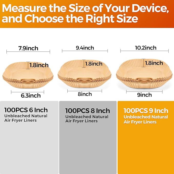 - Liners Size: Vailnd air fryer paper liners are in 9 inches at bottom diameter, suitable for both 8qt/10qt/11qt/12qt or larger round and square baskets. Heat resistant temperatures up to 428 fahrenheit