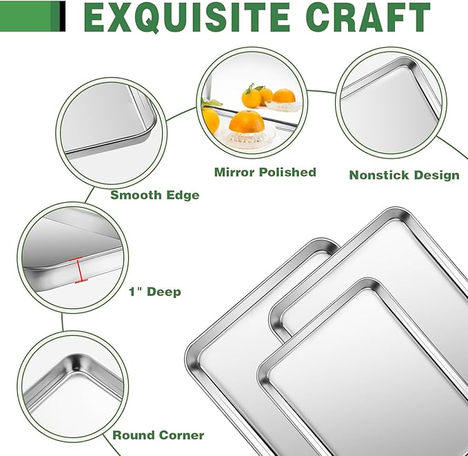 - Smooth Surface and Coating-Free: Our baking pans set features an ultra-smooth surface that prevents food from sticking and can be easily cleaned with warm soapy water. Non-stick surface of baking tray makes clean up a breeze. It is permanently rust-resistant, making it the perfect alternative to aluminum baking pans