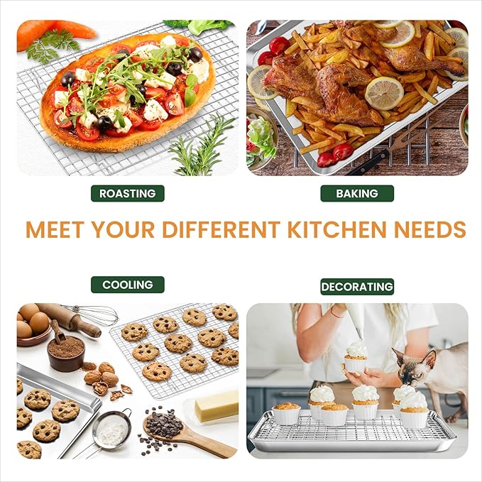 - Comes with Wire Rack: When used with the included wire rack, our cookie sheets for baking effectively prevent food from sinking into grease, resulting in crispier, tastier, and healthier food. The cooling racks for cooking and baking elevate the food above the pan, allowing air and heat to circulate evenly. This ensures more uniform heating and enhances the overall baking and roasting results
