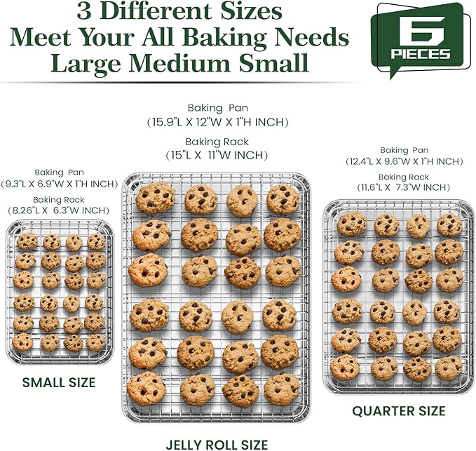 - Dimensions and Versatility: Our baking sheet set includes 3 cookie sheets: large (15.9 x 12 x 1 inch), medium(12.4 x 9.6 x 1 inch), small( 9.3 x 6.9 x 1 inch), and 3 cooling racks match each size. These baking sheets non stick are ideal for baking cookies, bread, and fries, as well as roasting bacon and meat. It is compatible with ovens, microwaves, and bread machines