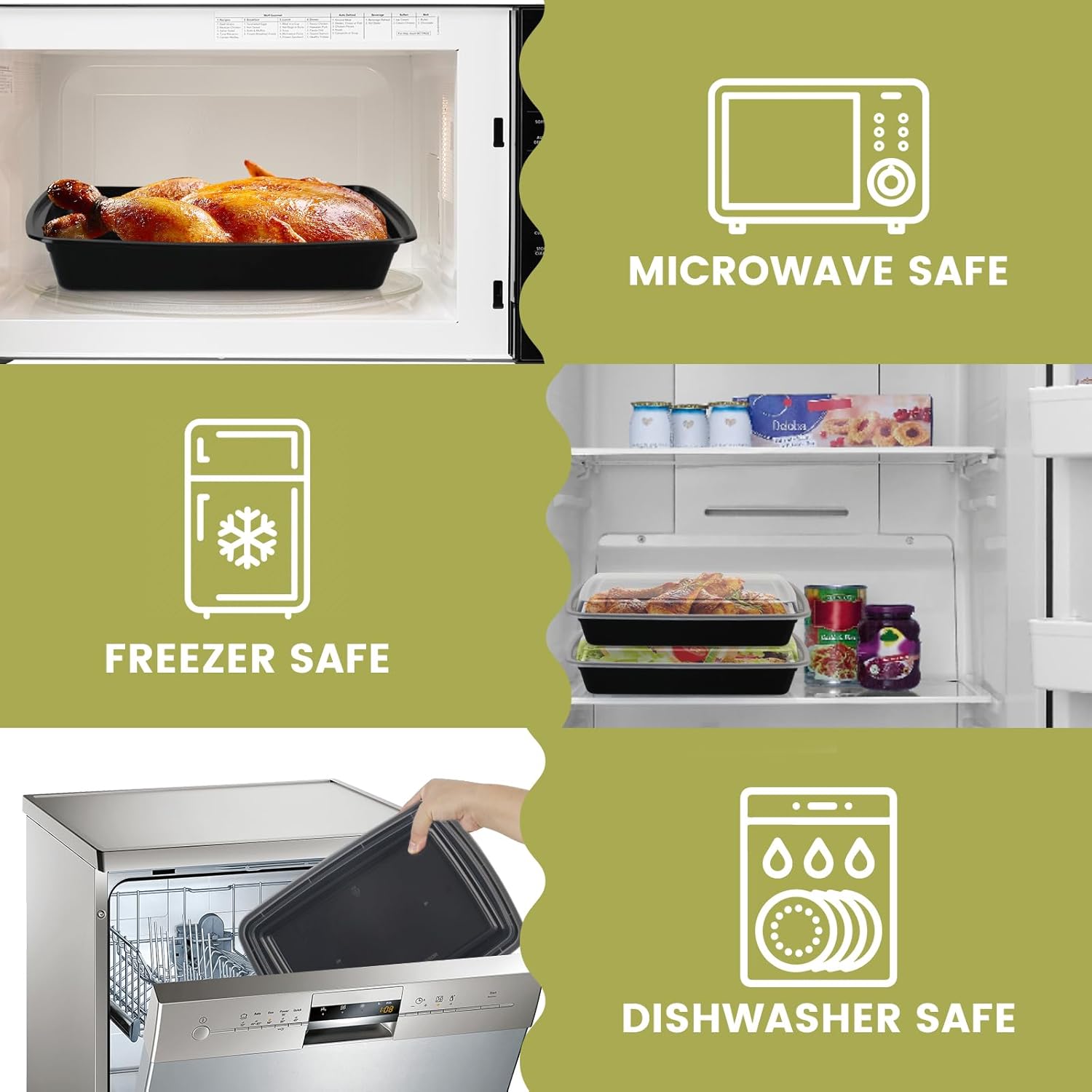 - 【Microwave, Dishwasher and Freezer Safety】 These microwave-safe meal prep containers make mealtimes more efficient and convenient. Strong crack resistant material is dishwasher safe and can be washed in the top rack of the dishwasher repeatedly. And stackable and lightweight design allows for easy storage freezer.