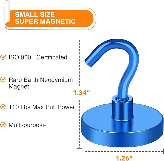- 【Premium Magnetic Hooks】- Ni+Cu+Ni Triple Layer nickel coating greatly reinforces corrosion resistance. The best coating available, which provides a shiny and rust resistant coated steel cup provides protection for the strong metal magnetic hooks and helps to prevent chipping or cracking, Safe to Use!