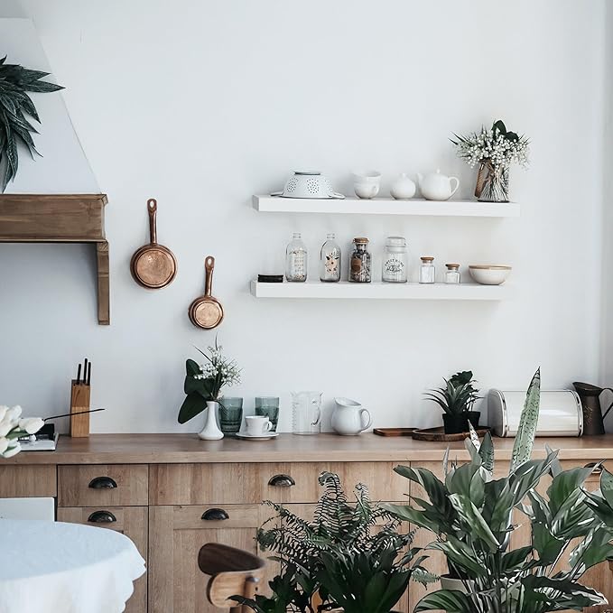 - STRONG AND DURABLE: Crafted from high-quality materials, these kitchen wall shelves are 1.3 inches thick and 11 inches wide, capable of holding up to 50 pounds. Solid brackets ensure no sagging or wobbling, providing reliable support for your favorite items.