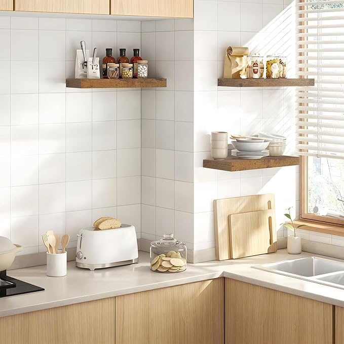 - STRONG AND DURABLE: Crafted from high-quality materials, these kitchen wall shelves are 1.3 inches thick and 9 inches wide, capable of holding up to 50 pounds. Solid brackets ensure no sagging or wobbling, providing reliable support for your favorite items.