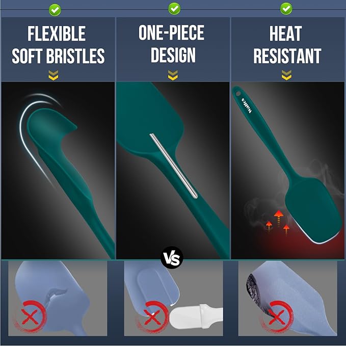 - 【One-Piece Design】Make sure that your silicone spatulas don't trap food particles, clean up easy and keep your food safe. Ergonomic handle is very easy to grip ! Each spatula has a perfect angle and a soft silicone surface, which is very easy to scrape the food in the bowl.