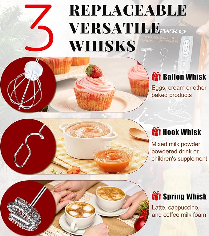 - 🔥【3 REPLACEABLE STAINLESS WHISKS】3 detachable whisk heads are included in this coffee stirrer. Type U of coffee frother is suitable for mixed milk powder and supplements for children. The mesh type is suitable for a latte, cappuccino, and coffee. There is also a model specific to baking. Easily switch to use, suitable for a variety of kitchen use scenarios.