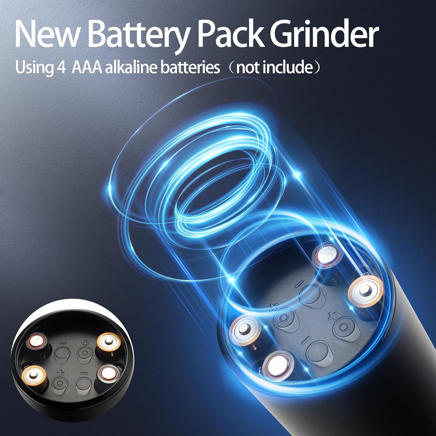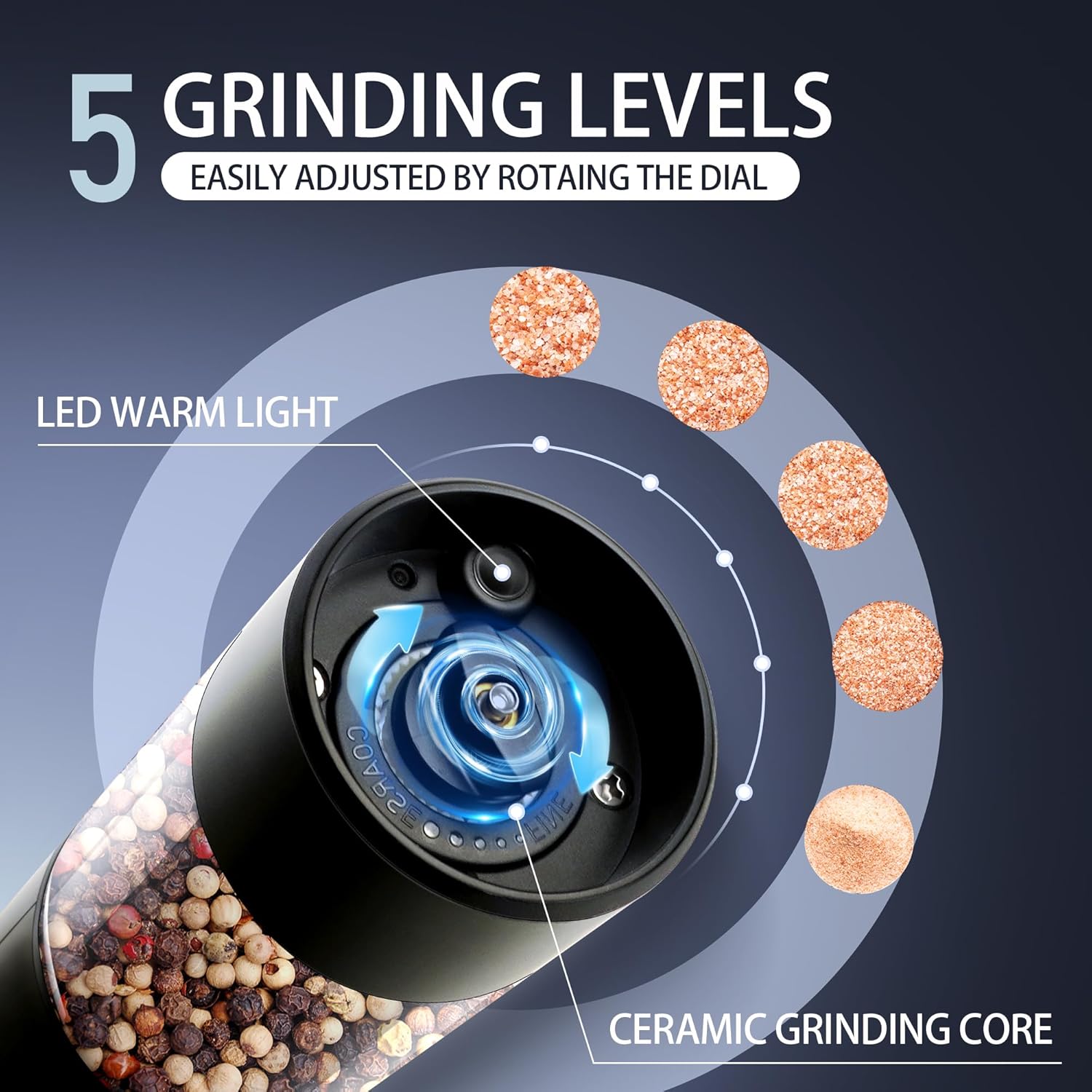 - 【ADJUSTABLE COARSENESS】The electric salt and pepper grinder set easily adjusts coarseness by rotating the bottom, clockwise to fine particles and counterclockwise to coarse particles, so feel free to choose the size of particles you need,A better kitchen appliance.