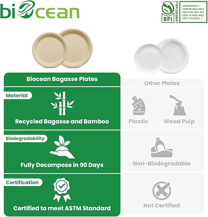 - Eco-Heroes in Action - Certified by BPI, our compostable paper plates transcend disposability, gracefully returning to nature in just 90 days. No landfill destiny; they leave zero waste and make a profound impact, showcasing our unwavering dedication to a cleaner, greener planet