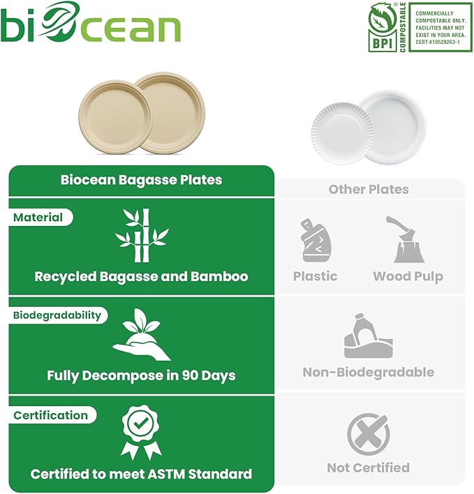 - Eco-Heroes in Action - Certified by BPI, our compostable paper plates transcend disposability, gracefully returning to nature in just 90 days. No landfill destiny; they leave zero waste and make a profound impact, showcasing our unwavering dedication to a cleaner, greener planet