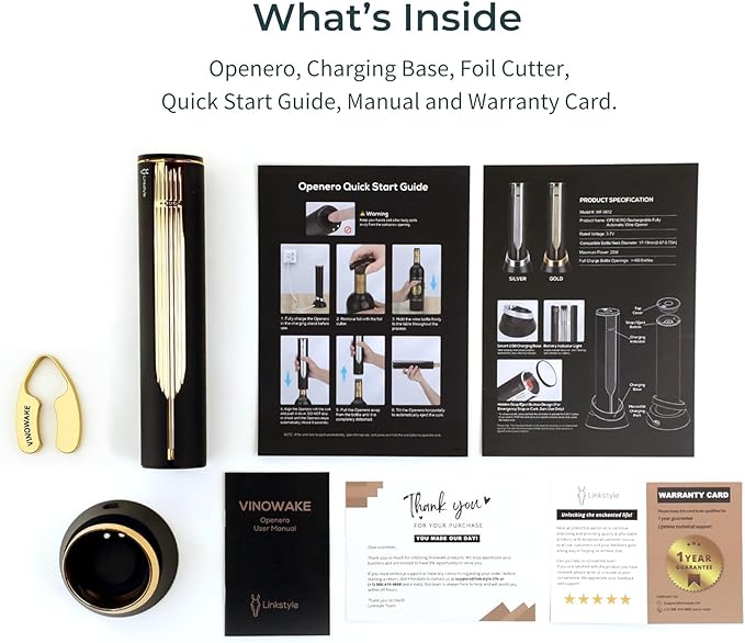 - 【Gift-Ready Set with Lifetime Support】: Every opener ships in a rigid, velvet-lined presentation box alongside a matching steel foil cutter that nests neatly into the charging base, no extra wrapping needed. LINKSTYLE backs the set with a one-year mechanical warranty and lifetime technical support. If anything ever goes wrong, a quick message gets you help or a replacement, adding peace of mind to an already impressive gift.