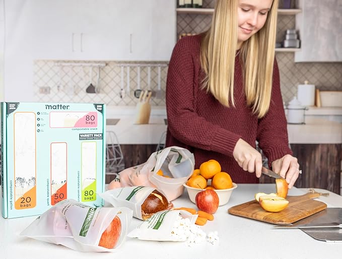 Matter Compostable Assorted Kitchen Bags, 230 Count, Biodegradable, Eco-Friendly Resealable Food Storage Variety Pack, 80 Snack, 80 Sandwich, 50 Quart & 20 Gallon