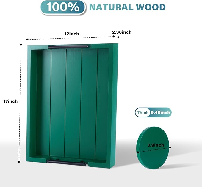 - BEAUTIFUL HANDCRAFTED DESIGN β Carefully crafted from premium quality fir wood with fine attention to details, our wooden serving tray set or tray for ottoman coffee table has ergonomically fitted metal handles for ease of carrying. Measuring 17βx 13β, this wood serving tray (rectangle) is the ideal size to carry snacks, drinks, and meals around the house without any hassle - WONDERFUL home decor!