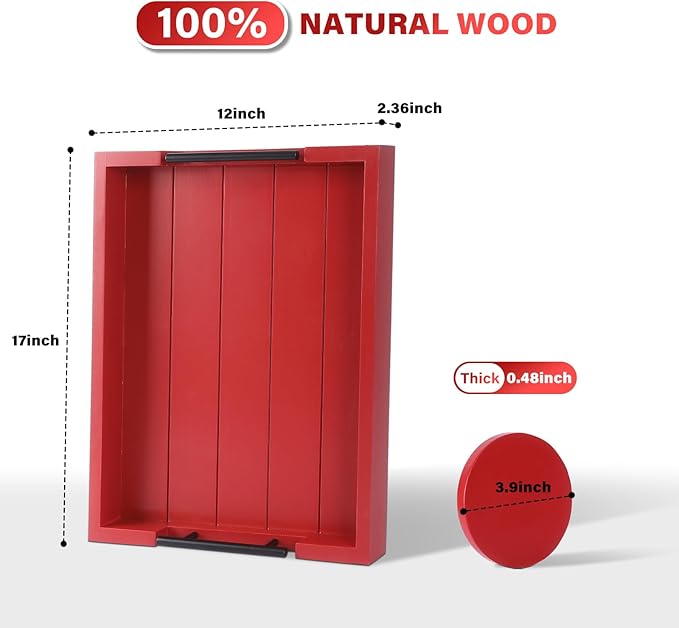 - BEAUTIFUL HANDCRAFTED DESIGN β Carefully crafted from premium quality fir wood with fine attention to details, our wooden serving tray set or tray for ottoman coffee table has ergonomically fitted metal handles for ease of carrying. Measuring 17βx 13β, this wood serving tray (rectangle) is the ideal size to carry snacks, drinks, and meals around the house without any hassle - WONDERFUL home decor!