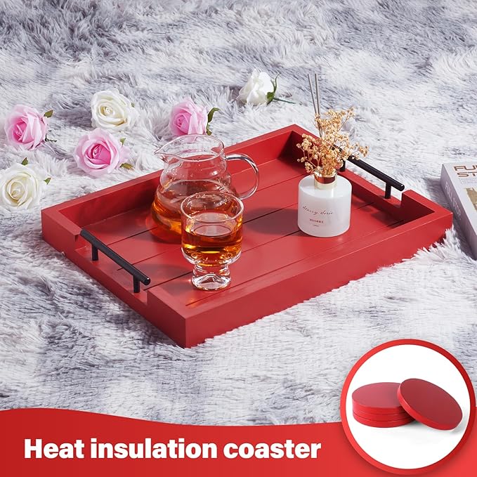 - INCLUDED WOODEN COASTERS SET OF 4 β Along with our wooden serving trays, we also provide a set of 4 natural wooden coasters that have a tasteful torched appearance. These wooden coasters for drinks are the best way to protect your tables from spills, mess, and stains while also adding a decorative element to your home, uplifting the overall aesthetic appeal β MUST HAVE ottoman tray with handles can be used as a Drink Tray!