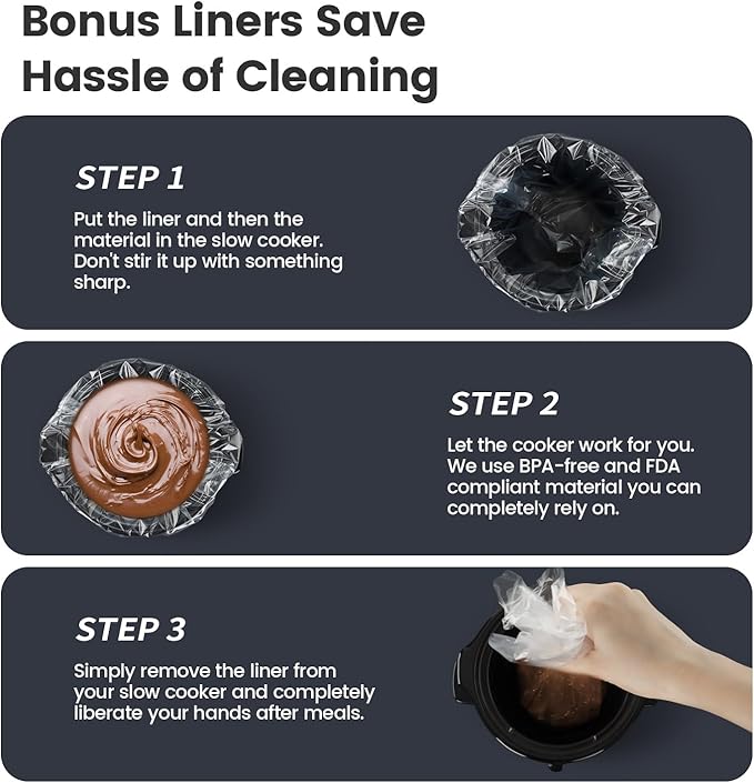 - [6 FREE SLOW COOKER LINERS] Easy to clean mini slow cooker,With the inclusion of KOOC slow cooker liners, cooking becomes even more effortless. You can enjoy the convenience of easy cleanup while still benefiting from the slow cooker's versatility in preparing a wide range of delicious meals