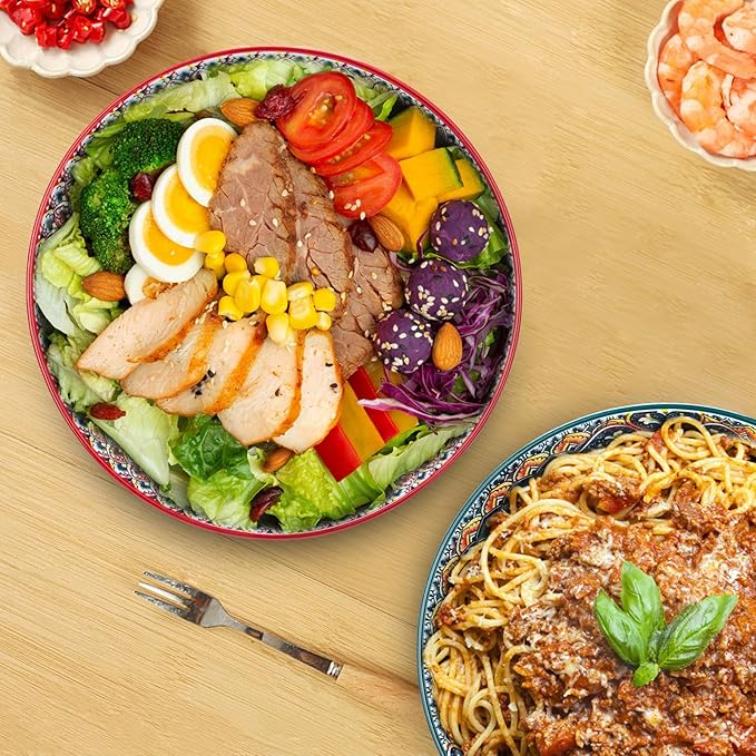 Large Serving Bowls, 75 Oz Fruit Salad Bowls Set of 2, Bohemian Style Large Porcelain Dishes for Entertaining Parties,Big Bowls for Salad, Pasta, Fruit, Chips, 10.3 Inch Diameter (red.red)