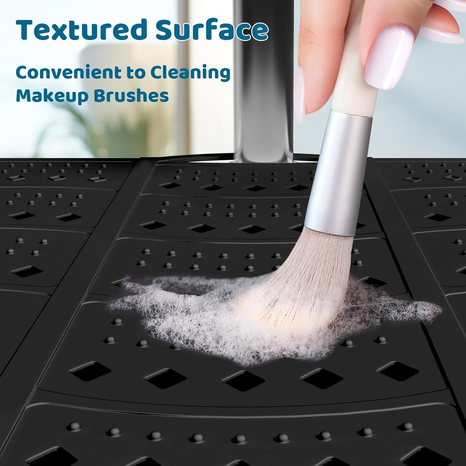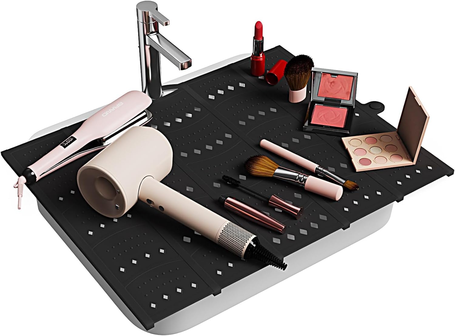 - High Quality: Crafted from high-quality silicone, this sink cover heat resistant up to 450 degrees Fahrenheit, safely place hot styling tools such as curling irons, hairdryers, or straighteners on its surface. And it with raised particle on the surface, convenient for you to clean your makeup brush.