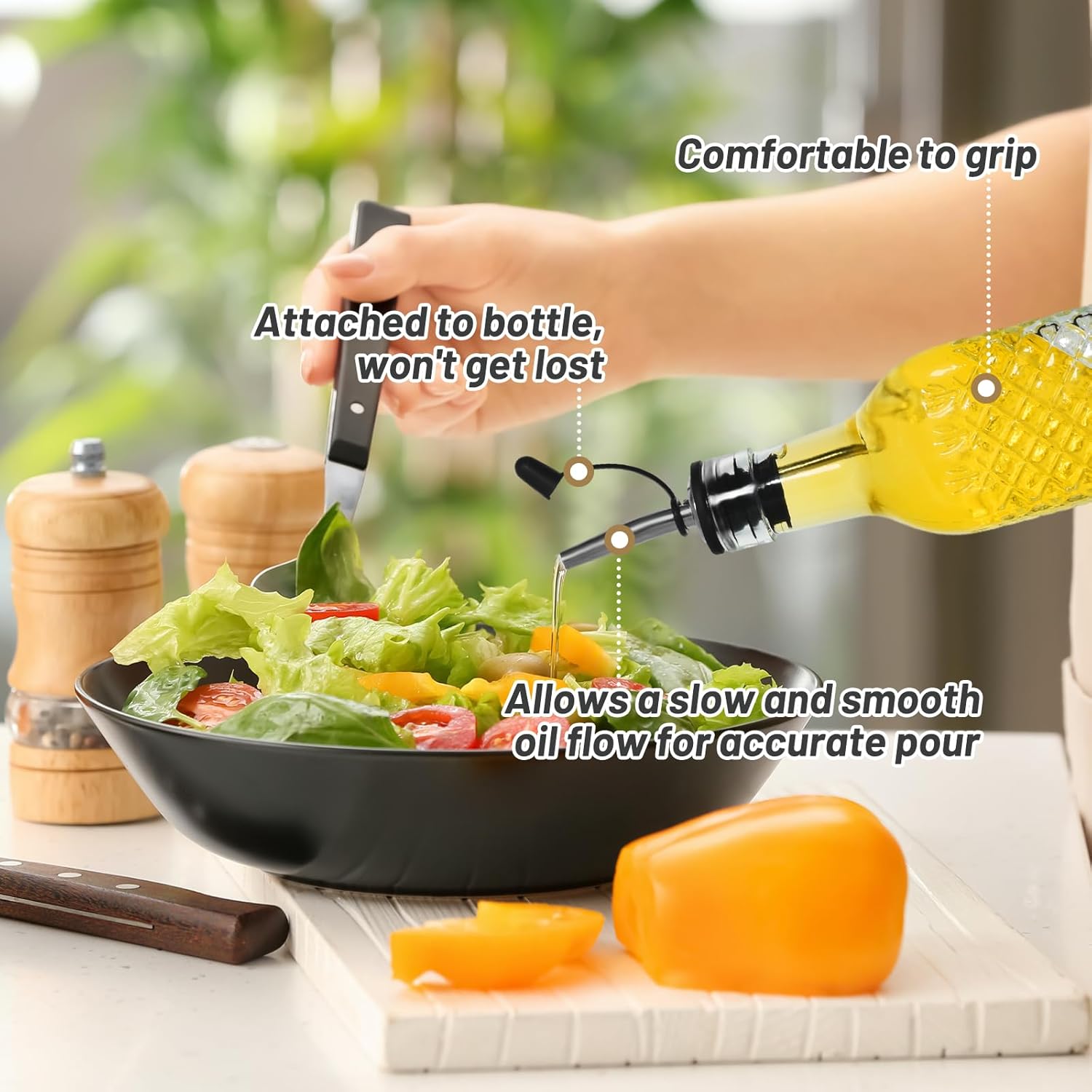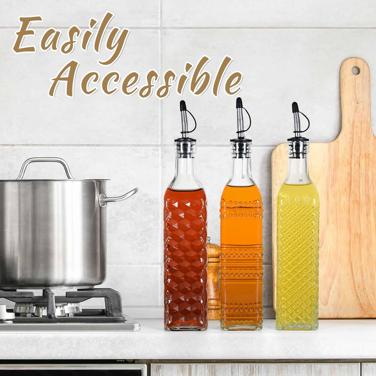 - Lead-free & Food-safe Glass: Oil dispenser bottles are transparent, which makes level and content visible, 17 fl oz capacity is ideal for holding oil, soy sauce, vinegar, keeping your kitchen condiment organized