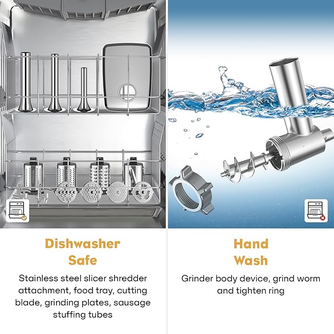 - Easy to Clean and Support: For kitchenaid mixer attachments only the slicer shredder attachments are dishwasher safe. The meat grinder attachmnet recommend washing by hand, cleaning it with soap, warm water (shall not exceed 122 โ). The provided cleaning brush can clean any hidden crevices or corners. If you have any questions about the product, please contact us.