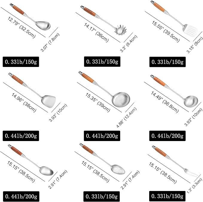 - Professional Kitchen Utensils Set: Clean lines, good weight and well balance. The wooden handles are not too heavy, help you eliminate stress on the arms and provide a comfortable ergonomic grip. Wooden handle reduce heat transfer, anti-scald, help you stay out of the soup or keep you away from the heat and flame.