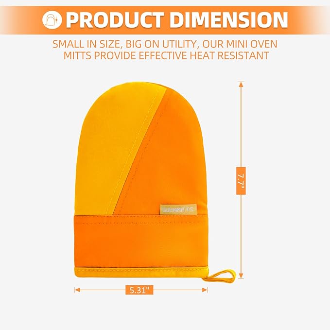 - 1 PAIR MINI SIZE OVEN MITTS: The size of the oven mitts is 7.7x5.3 in(L x W). A simple and practical design can fit the palm better. The mini design makes kitchen mittens take off and wear more conveniently.