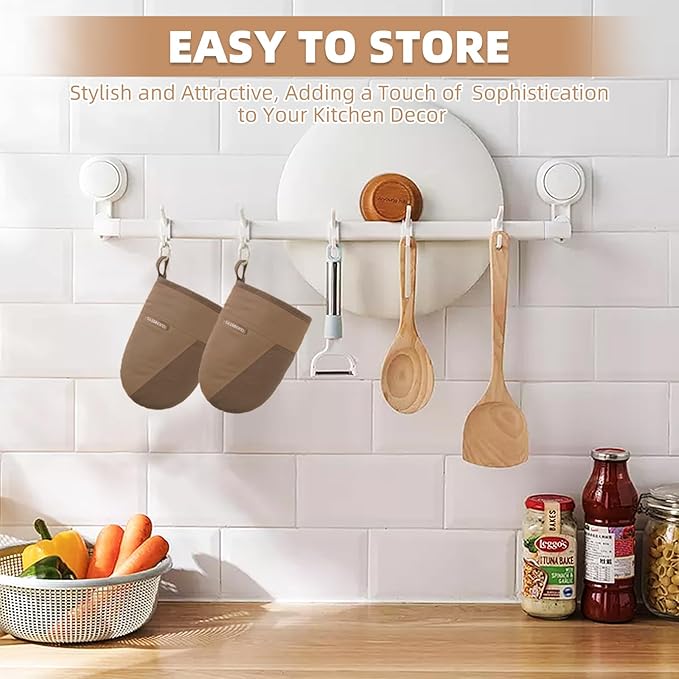 Mini Oven Mitts, Kitchen Oven Gloves Kitchen Mittens 500 Degrees Heat Resistant Baking Gloves, Non-Slip Silicone Surface with Hanging Loops Hot Gloves for Cooking, Baking, BBQ 1 Pair-Brown