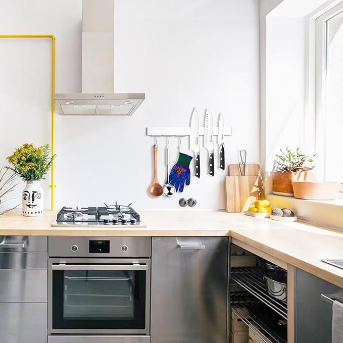 - 【Robust Magnetic Strip】 Our this magnetic knife bar, made from premium 304 stainless steel, with 3 removable hooks, combines the strength of neodymium and ferrite magnets. This ensures a powerful and enduring hold for your knives, with no risk of rust or weakened magnetism, offering lasting kitchen efficiency