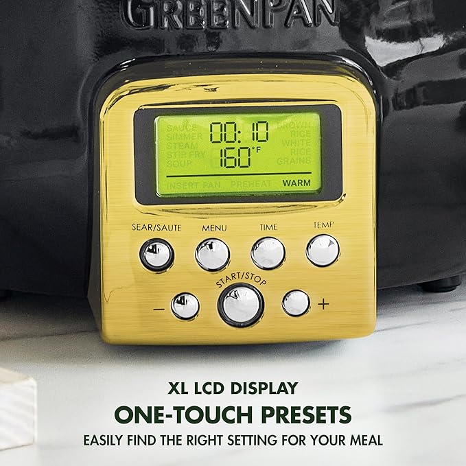 GreenPan Elite Essential Smart Electric 6QT Skillet Pot, Presets to Sear Saute Stir-Fry and Cook Rice, Healthy Ceramic Nonstick and Dishwasher Safe Parts, Easy-to-use LED Display, Gold