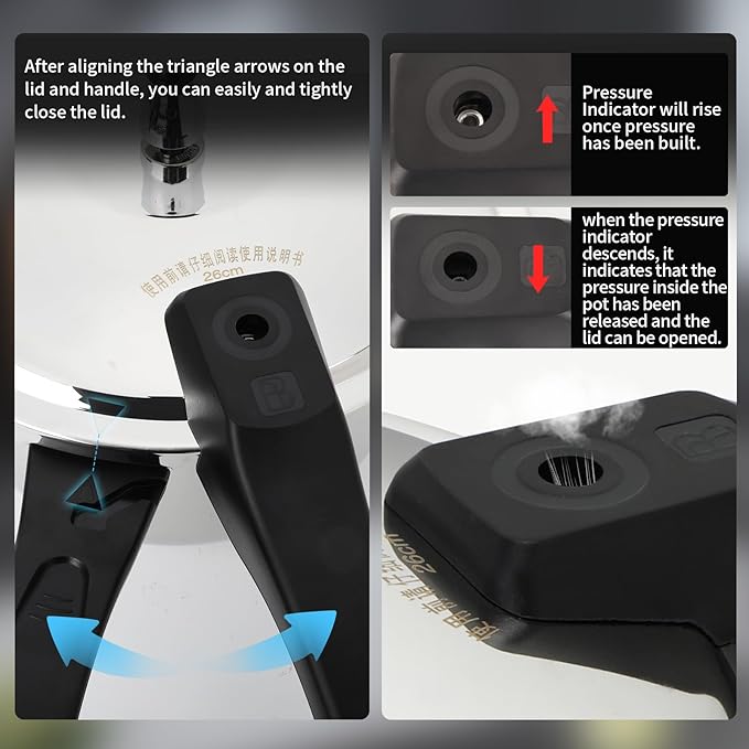 - ✅[Multiple safeguard devices]-The induction pressure cooker equipped with multiple safety devices such as pressure indicator, pressure regulator and emergency release valve. The pressure indicator will according to the pressure to rise and fall to lock the lid, and the pressure regulator automatically maintains cooking pressure. When the pressure inside the cooker exceeds safety limit, the emergency release valve can automatically relief the pressure ensure safe use. This kind of design is a revolution in traditional pressure cooker technology.