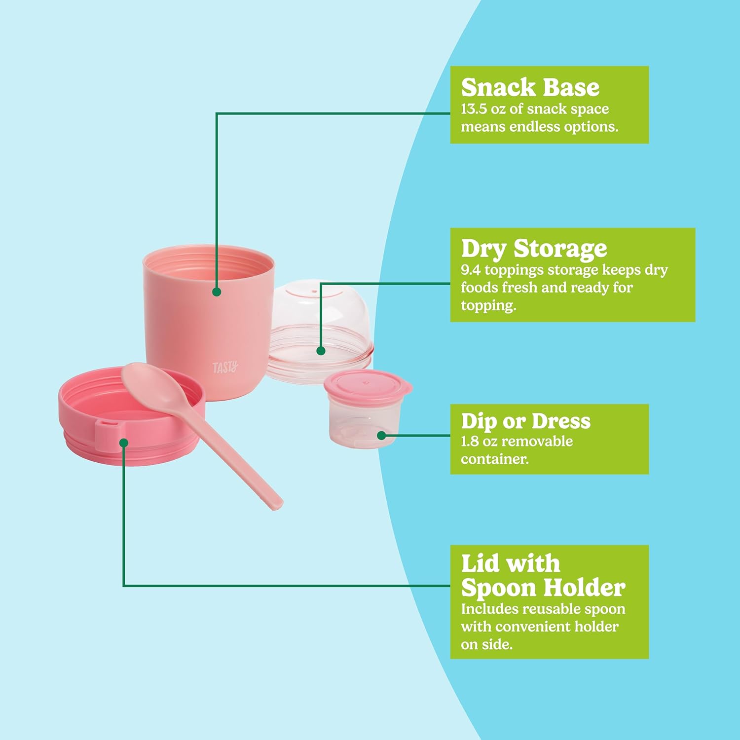 Tasty Travel Snack Cups with Spoons, On-The-Go Snacking, Divided Compartments, Great for Nuts, Cereal, Granola, Yogurt and More, Made Without BPA, 2-Pack, Pink